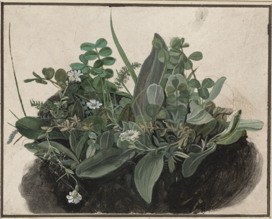 Mniejsze studium trawy przedstawia kępkę wyciągniętą z ziemi, jednak widać tu znacznie więcej roślin. Odnajdujemy stokrotki, koniczyny, maleńkie chwasty, które tworzą uroczą przyrodę otwartych pól. Co ciekawe, dla współczesnego oka obraz ten wydaje się być podobny do fotografii. Jakież to musiało robić wrażenie na ludziach z XVI-stulecia!